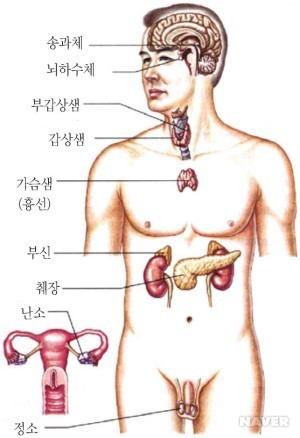 | 티록신(thyroxine,T4), 삼요오드티로닌(Triiodothyronine,T3) | 갑상선 | 골격 성장, 중추신경계의 성숙, 기초 대사량 증가 | 어린이 : 크레틴병 성인 : 정액수종 |