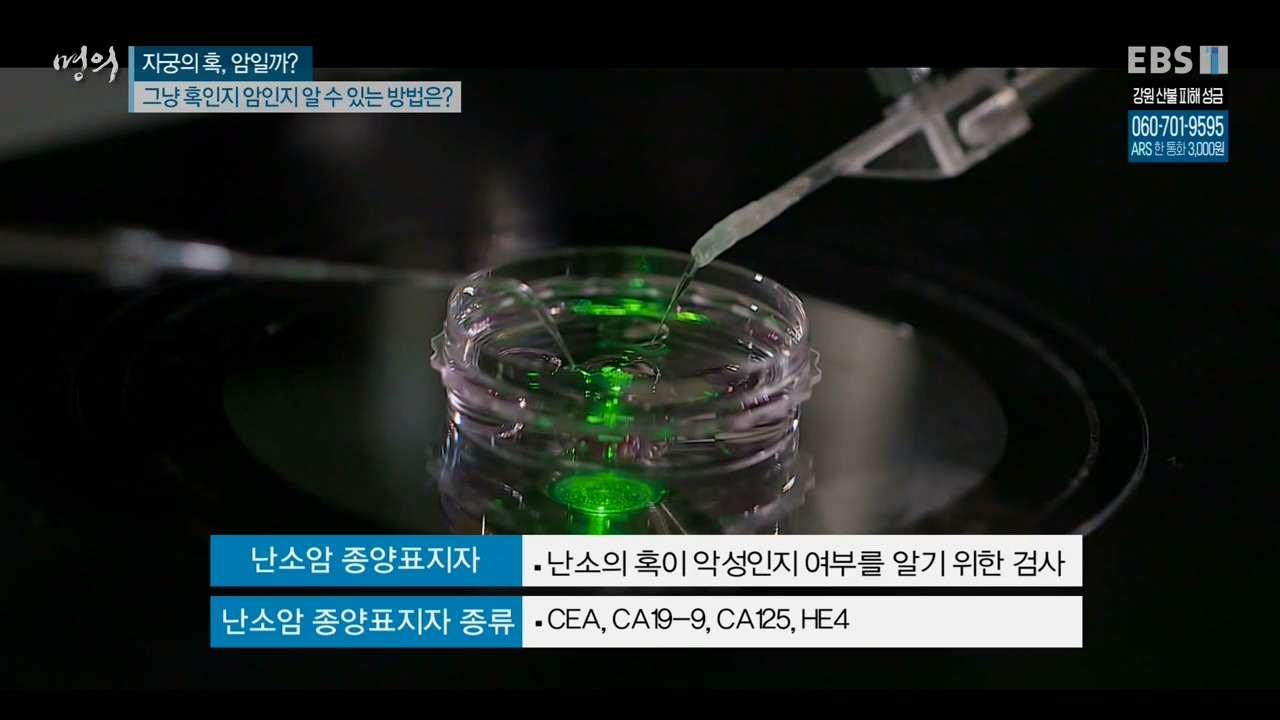산부인과 의사들이 엄청 고민하는 부분 중 하나입니다. '난소암을 어떻게 빨리 발견할 수 있을까?' 모든 암이 다 그렇지만 좀 빨리 발견하면 아무래도 치료도 수월한 경우가 많고 생존율도 당연히 올라갈 것이고 그렇기 때문에 빨리 발견하기 위한 노력을 하고 있는데 최근까지 CA125라고 부르는 종양표지자, 암 수치라고 보통 이야기를 하는데 종양표지자 검사와 초음파 검사를 1년에 한 번씩 하는 이 정도 외에는 암을 발견하기 위한 특별한 방법이 없는 것으로 알려져 있습니다. 그런 부분을 안타깝게 생각하고 많은 연구를 하고 있는데, 혹시나 혹이 발견되면 그 다음부터는 주기적으로 담당 선생님들이 권유 드리는 3개월 또는 6개월마다 정기검사를 받으시는 걸 권유 드리고 있습니다.