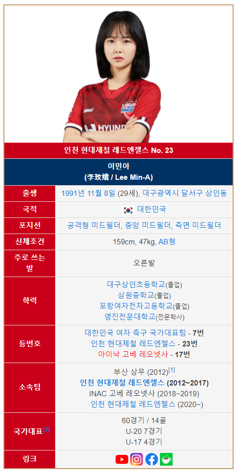 인천 현대제철 레드엔젤스 소속이었으며 2017 시즌 종료 후 일본의 고베 아이낙으로 이적했다가 다시 현대제철로 복귀했다. 흔히 심서연과 더불어 얼짱 축구선수로 잘 알려져 있는데, 심서연이 말 그대로 예쁜 외모라면 이민아는 귀여운 외모로 많은 남자 팬들을 확보 중이다.
