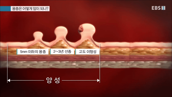 평평하고 매끈하던 정상조직은 비정상적으로 자라 돌출되고 2-3년이 지나면 암으로 크는 선종이 됩니다.