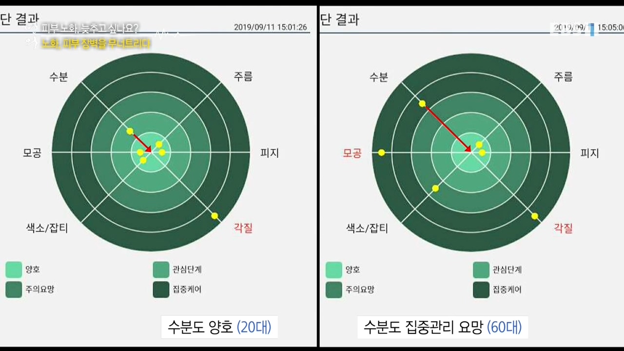 햇빛을 보거나 할 경우 독성 물질 등이 우리 몸에 닿게 되면 피부 세포에서 즉각 15분 이내에 활성 산소들이 만들어지면서 세포막에 잇는 지질 성분, 세포의 단백질 성분, 기타 여러 가지 구조물의 성분들에 손상을 일으켜서 염증을 유발하게 됩니다. 콜라겐, 탄력소, 진피의 성분들의 절대적인 양이 점점 감소하게 되면서 겉으로 쭈글쭈글하게 주름살이 보이게 되는 것입니다. 제일 중요한 것은 광노화를 막는 것입니다.