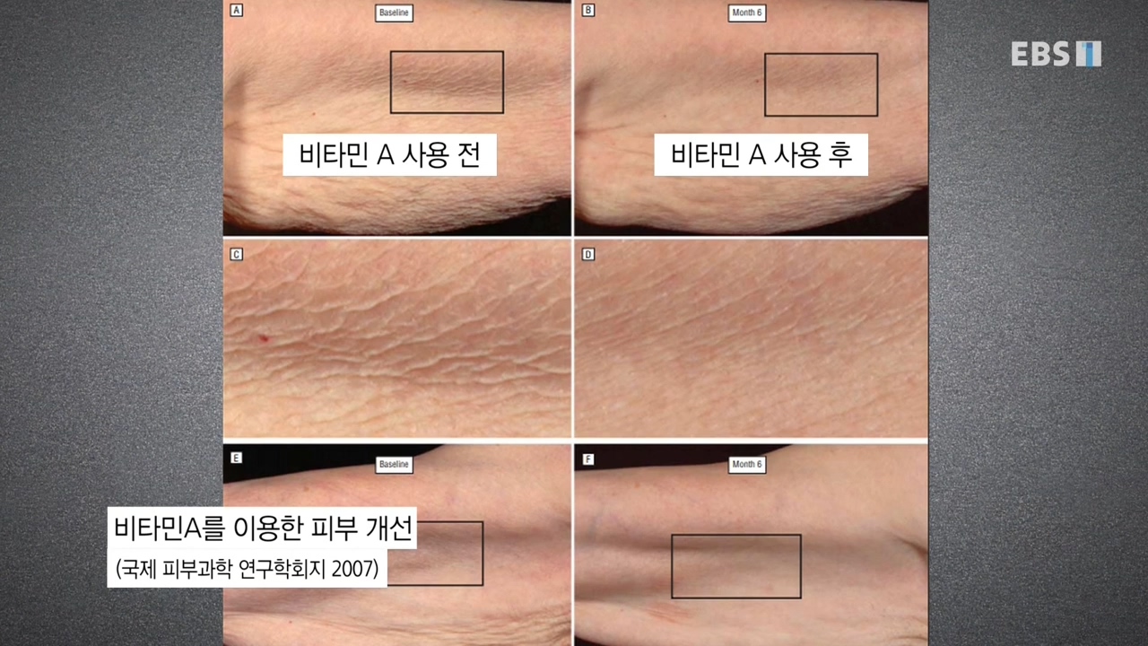 비타민 A는 다른 말로 '레티놀'이라고 하는 성분입니다. 우리 피부 노화를 예방하는 효능에 대해서 많이 연구되어 있고 몇 십년 전부터 효능이 잘 입증된 물질입니다. 대표적 효능이 콜라겐 섬유를 많이 만들게 되고요. 탄력 섬유도 많이 만들고 또 콜라겐 섬유와 탄력 섬유를 분해하는 효소들이 있는데 그 효소들의 발현을 억제합니다.