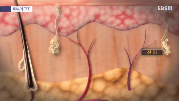 진피는 섬유성분과 단백질, 탄수화물로 구성되어 있으며, 피부에 힘이 생기게 하고 피부모양을 유지시켜 줍니다. 만약 노화로 인해 진피가 얇아지고 약해지면 주름이 생기게 됩니다.