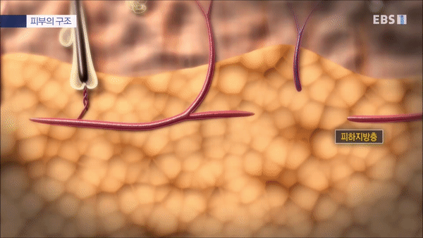 진피 아래 피하지방층은 우리가 섭취한 에너지 중 남은 부분을 지방 형태로 저장하는 것으로 체온을 유지하고 필요한 경우에는 에너지원으로 사용하게 됩니다.