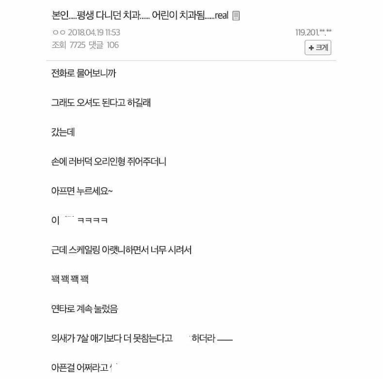 🏥 병원ㅣ질병ㅣ질환/치과 (유머) 평생 다니던 치과가 어린이 치과됨 by 두용이 2021. 4. 28. 반응형 반응형 공유하기 게시글 관리 외시경실 관련글 한국인 치아 변색의 범인 현대 치과의학의 상징 (유머) 간호사를 울렸습니다 빠진 치아를 방치하면 안되는 이유 댓글