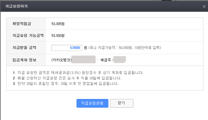 그래서 5원을 남겨두고 53,000원을 지급요청하였습니다.