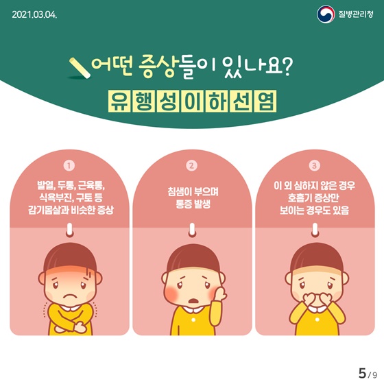 가. 발병일로부터 1~2일 경과하여 오한, 식욕부진, 두통, 근육통, 오심, 한쪽이나 양쪽 이하선의 종창, 발열(38~40℃), 부종, 연하 곤란 등