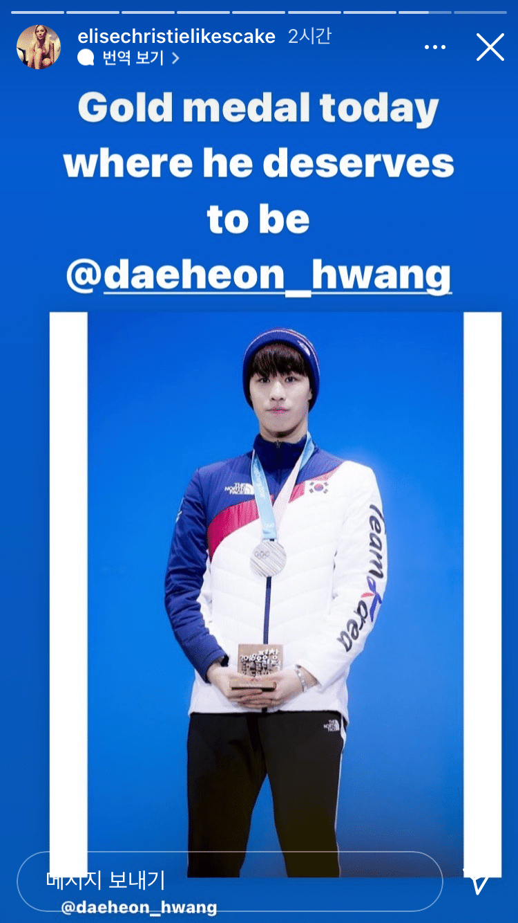 황대헌 축하해주는 영국 쇼트트랙 선수 엘리스 크리스티