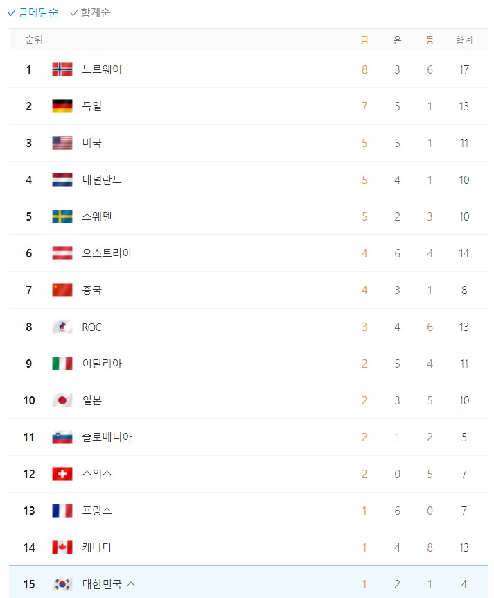 😄 운동 스포츠/올림픽 패럴림픽 현재 올림픽 순위 (2022-02-12) by 두용이 2022. 2. 12. 반응형 현재 올림픽 순위 2022-02-12 대한민국 15위 반응형 공유하기 게시글 관리 외시경실 관련글 (베이징 올림픽) 여자 컬링 1타3피.gif (베이징 올림픽) 스켈레톤 김은지 선수 장갑 세리모니 무한도전이 또! (feat. 곽윤기) 방송 3사 전부 대형 방송사고 (feat. 차민규 은메달) 댓글