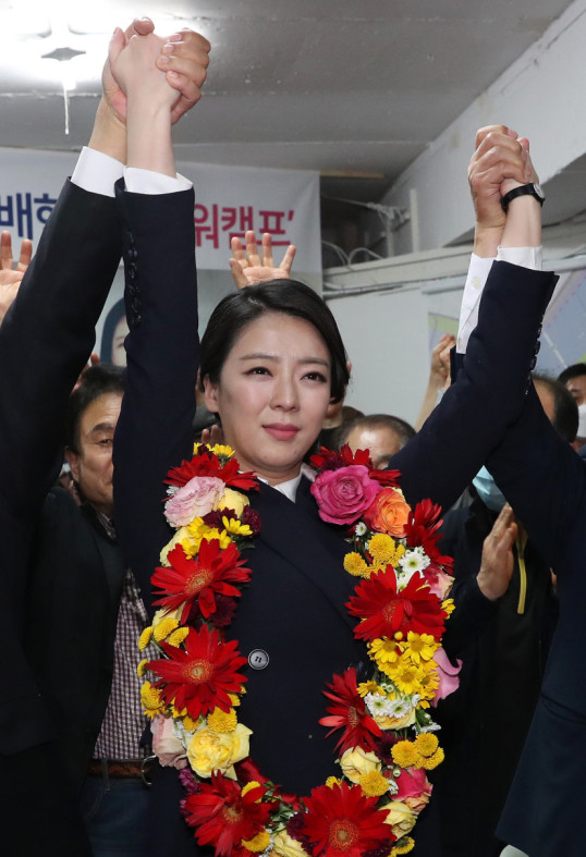 김은혜와는 같은 MBC 뉴스데스크 앵커 출신으로 수도권을 지역구로 하는 21대 여성 의원이라는 공통점이 있다. 이 때문인지 미래통합당 당선자 총회에서 서로 포옹하기도 했다. 또한 윤석열 대통령 당선인 자리도 김은혜 의원이 물러나면서 이어받았다.