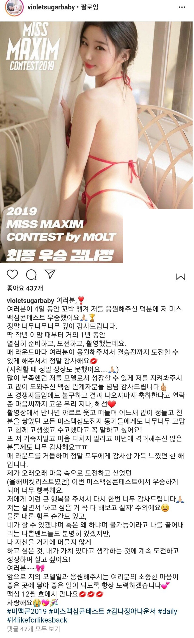 2019 미스 맥심 콘테스트에 참가해서 우승했다.