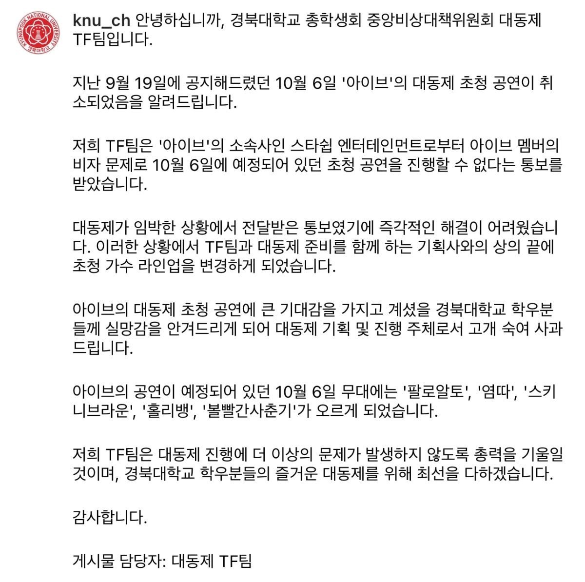 바로 어제 경북대 학우분들께 출연자 변경을 알리는 공지글이 올라온 것을 보았습니다 당연히 스타쉽에서는 출연이 정해져있지 않았으니 반대의 입장문을 내게되었고, 바로 사태의 심각성을 인지하고 저희 에이전시 임원들이 현재 대구에 내려와 있습니다. 학우분들과 대동제 관계자분들 그리고 중간에서 노력한 현지 대행사에게도 사과를 드리고 싶고 무엇보다 이번 저희 에이전시와 대행사간에 소통 문제로 실질적인 피해를 보고 있는 경북대 학우분들과 스타쉽 그리고 아이브 멤버들에게도 진심으로 사과드립니다. 이런 소통 문제가 재발 되지 않도록 부단히 노력하겠으며 더욱 세심하게 신경쓰는 에이전시가 되도록 하겠습니다 긴 글 끝까지 읽어 주셔서 감사합니다