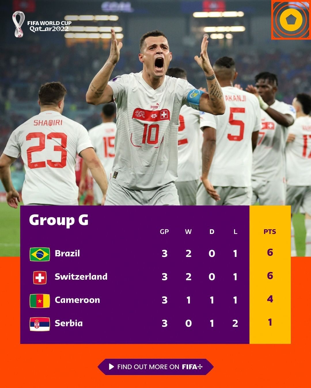 카타르월드컵 G조 5경기 세르비아 vs 스위스 움짤 결과 2022년 12월 03일 토요일 04:00 (한국시각) 세르비아 라인업 스위스 라인업 스위스 첫번째 골 샤키리 전반 19분 세르비아 첫번째 골 미트로비치
