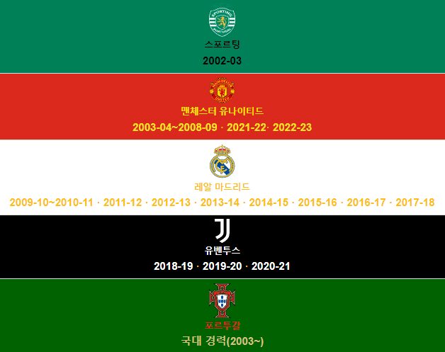 스포르팅 CP - 28번 맨체스터 유나이티드 FC - 7번 레알 마드리드 CF - 9번, 7번 유벤투스 FC - 7번 |