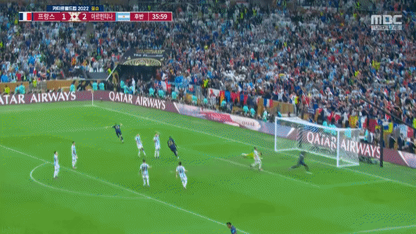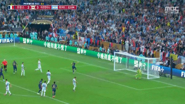 카타르 월드컵 결승전 음바페 추가골.gif (아르헨티나 2:2 프랑스) 프랑스는 후반 35분 음바페의 페널티킥 골에 이어 후반 36분 음바페의 발리 슈팅으로 순식간에 동점을 만들었다. 후반 37분 음바