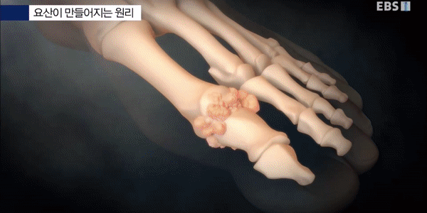 요산 결정체가 관절에 쌓이게 되면서