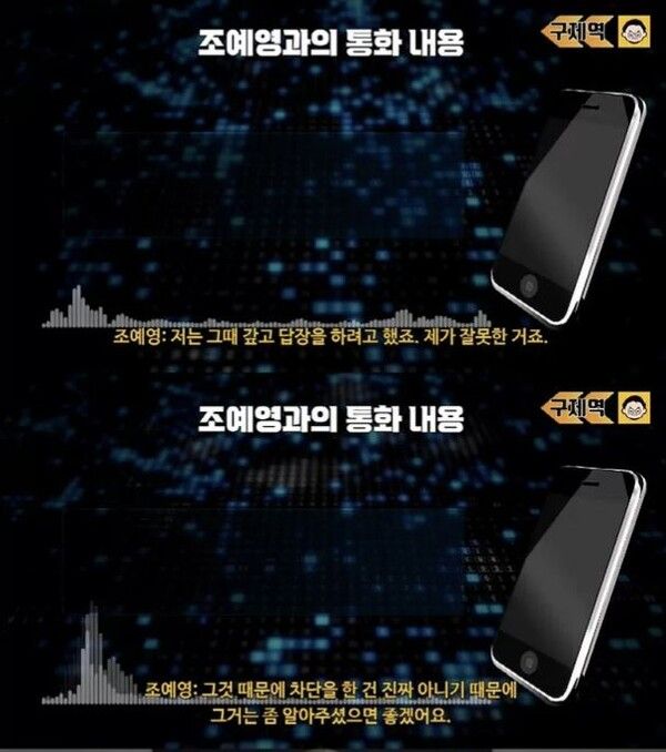 이에 유튜버는 "혹시나 하는 마음에 제보를 받는다는 글을 올렸더니 조예영한테 바로 전화가 왔다"며 녹음한 통화 내용을 공개했다.