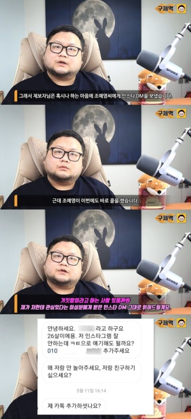 유튜버에 따르면 제보자는 "'돌싱글즈3'를 인상 깊게 본 뒤 조예영에게 DM을 보냈다. 조예영은 연락처를 알려줬고, 조예영과 직접 만나 식사도 했다"고 이야기했다.