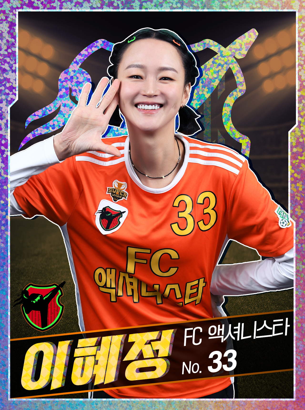 이혜정 프로필 (FC 액셔니스타) 이혜정 Lee Hye jung 출생 1984년 6월 18일 (38세) 국적 대한민국 신체 181cm(179cm), 58kg, 260mm 33-25-35 inch 학력 선일여자고등학교 직업 前 농구선수 (센터), 모델, 배우 프로 입