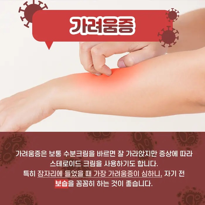 가려움증은 보통 수분 크림을 바르면 잘 가라앉지만 증상에 따라 스테로이드 크림을 사용하기도
