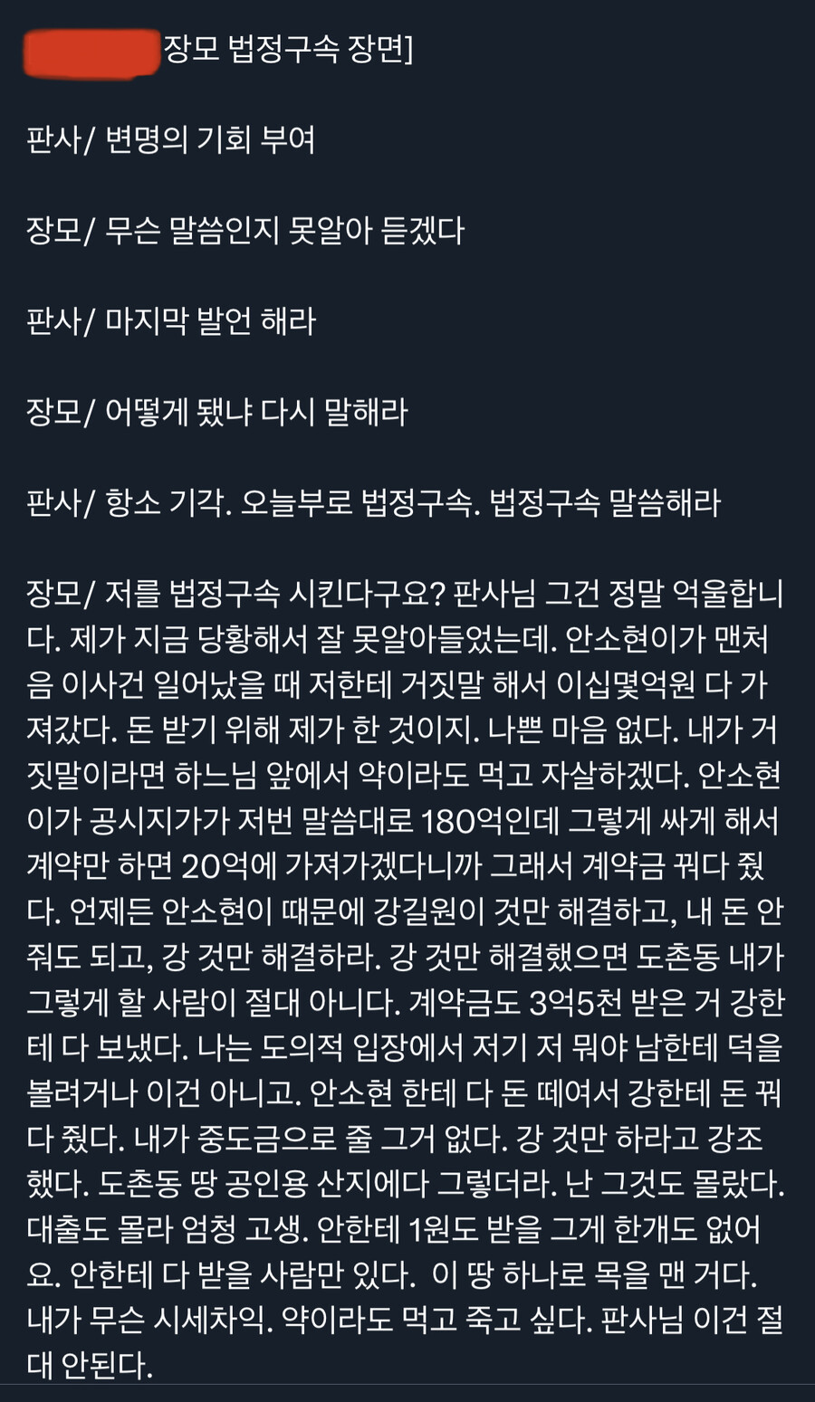 최씨는 "제가 시세 차익을 얻으려고…약이라도 먹고 죽고 싶습니다. 판사님 이건 절대 안 됩니다"라고 목소리를 높였다.