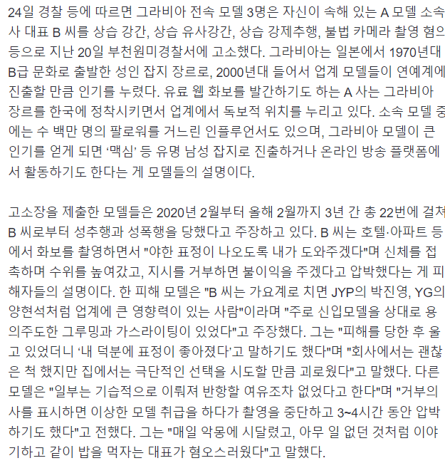 성인용 화보를 촬영하는 업체 대표가 소속 모델들을 추행하고, 성폭행 한 혐의로 고소당했다. 피해 여성들은 대표가 "전속 계약을 끊겠다"는 등 협박을 하며, 수년 간 성착취를 했다고 주장했다.