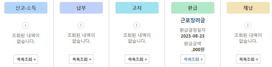 4번째 항목에 '근로장려금'에 심사조회 결과를 알 수 있을 것이다.