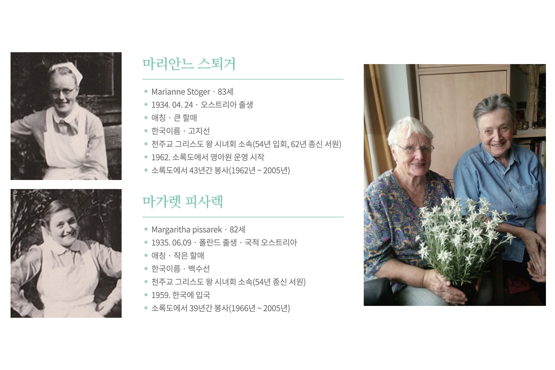 마리안느와 마가렛 간호사는 20대인 1962년과 59년에 각각 한국으로 넘어와 약 40년간 소록도에서 한센인을 위해 자원봉사를 했습니다. 그러다 2005년 건강이 악화되자 부담이 되고 싶지 않다는 편지 한 통을 남겨두고 조용히 출국했습니다. 두 간호사는 2016년 6월 대한민국 명예국민이 되었습니다.